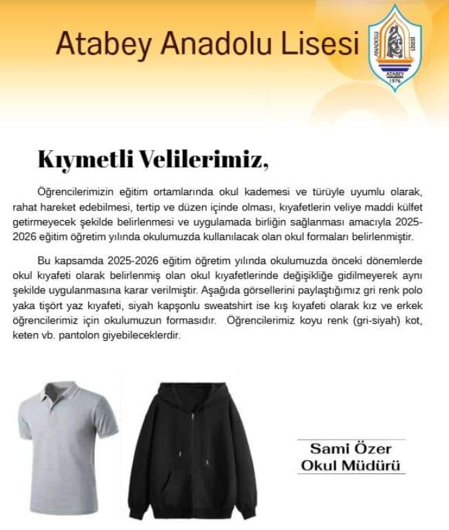Bu kapsamda; 2025-2026 eğitim öğretim yılında önceki dönemlerde okul kıyafeti olarak belirlenmiş olan okul kıyafetlerinde değişikliğe gidilmeyerek aynı şekilde uygulanmasına karar verilmiştir. Okulumuzda gri renk polo yaka tişört yaz kıyafeti, siyah kapşonlu sweatshirt ise kış kıyafeti olarak kız ve erkek öğrencilerimiz için okulumuzun formasıdır. Öğrencilerimiz koyu renk (gri-siyah) kot, keten vb. pantolon giyebilirler. Öğrencilerimizin okula formayla gelmesini önemle rica ediyoruz.